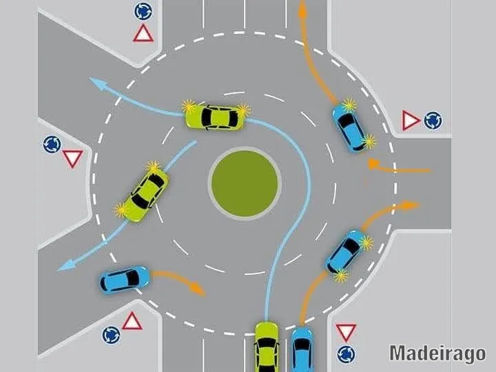 Důležité pravidlo si zapamatujte na kruhových objezdech!! Dělají to špatně i místní! Základním pravidlem je, že pokud odbočíte vpravo z kruhu na prvním výjezdu po vašem vjezdu do kruhu, vnější pruh je pro vás. Jakýkoli další výjezd poté, byste měli jet vnitřním pruhem- viz vizualizace.